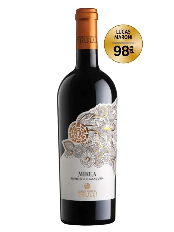 O Borgo dei Trulli Mirea Primitivo di Manduria DOP é um vinho único, elaborado a partir de uvas Primitivo que passam por um breve período de sobrematuração nos cachos. As plantas têm mais de 60 anos e um rendimento baixo de apenas 600g por planta, resultando em um vinho profundo e intenso. Notas de frutas negras secas, sândalo, especiarias e chocolate se destacam, criando uma experiência sensorial rica. Em boca, é quente e redondo, com um final muito longo, tornando-o um vinho ideal para meditação. Avaliado com 98 pontos por Luca Maroni, este vinho é uma verdadeira obra-prima. O vinho é maturado por 10 meses em barricas de carvalho francês de primeiro e segundo uso, seguidos de mais 6 meses em garrafa, o que contribui para sua complexidade e profundidade.
